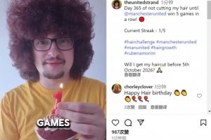 蓄发哥社媒晒出纪念蓄发一周年视频,配文:“不剪头发直到曼联5连胜,已过去365天,当前连胜状态——1/5。”