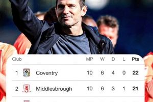 考文垂本赛季前10场英冠6胜4平保持不败,在积分榜上以1分优势领先米德尔斯堡位居榜首,球队10场比赛打进29球(联赛最多),只丢7球(已经连续5场零封)。